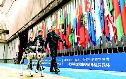 在互联网之光门口,首先向记者走来的是“显眼包”无人巡逻车和两条又萌又酷的智能警用机器狗,它们“迈”着整齐的步伐走来,瞬间吸引全场注意力。