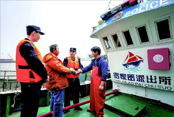 4月18日,临近伏季休渔期,岱山县公安局罗家岙派出所民警辅警乘坐“瀛洲红帆船”在辖区渔港进行巡查。民警辅警登上船头,开展矛盾纠纷化解、法律法规、安全防范宣传等工作,护航渔船民安全生产。通讯员 邹训永 姚旭阳 摄