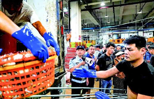 八月六日十四时许,中国舟山国际水产城喜迎首艘满载“第一风”梭子蟹的渔船归港。舟山市公安局普陀区分局水产品