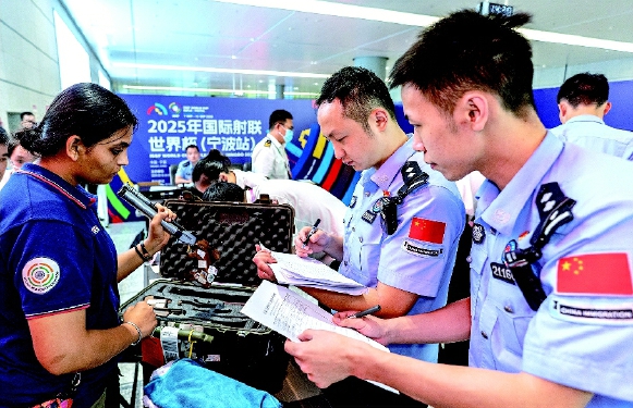 2025年国际射联世界杯(宁波站)于9月7日拉开战幕,全球43支代表队的300余名顶尖选手在宁波开启“逐梦之旅”。9月5日起,他们在宁波机场边检站民警的高效验放下顺利入境。 通讯员 张家其 摄