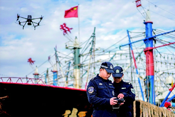 1月15日,岱山县公安局巡特警大队“鱼鹰”战队结合“冬季行动”,利用警用无人机对辖区渔港码头进行空中巡查,加强海上治安防控工作力度,守护渔船民安全生产。通讯员 邹训永 摄