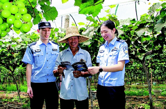 七月二十三日,金华市公安局金东分局孝顺派出所民警深入辖区葡萄种植点,集中开展反诈、防盗等安全防范宣传,叮嘱果农守好“钱袋子”。