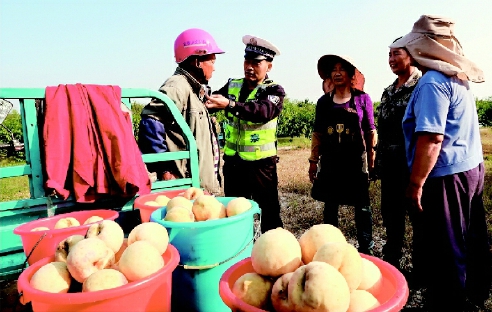金秋十月,硕果满枝。长兴县公安局林城派出所民警走进辖区桃园,向果农们发放交通安全手册,讲解交通安全知识,强调遵守交通规则的重要性。图为十月十一日,民警为果农讲解如何正确佩戴安全头盔。 记者 沈志良 摄