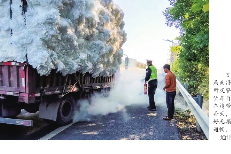 日前,湖州市公安局南浔区分局千金派出所交警出警归途中,遇货车自燃,立即取来随车携带的灭火器将火势扑灭,既确保了货物完好无损,又确保了道路通畅,赢得车主称赞。