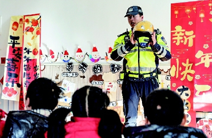 1月14日,金华市公安局交管分局婺城大队江北中队警员走进丰亭幼儿园,开设“平安春运 交警同行”交通安全宣教课。 通讯员 舒婷鸿 摄