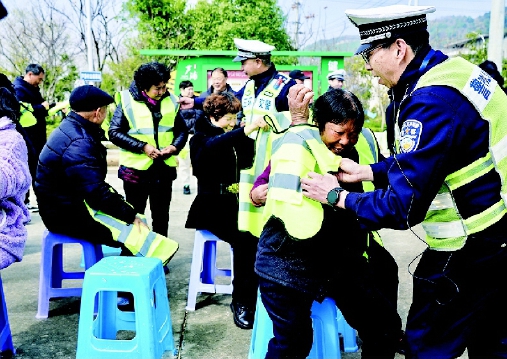 连日来,玉环交警及联勤派出所走村入户,积极开展老年人交通安全宣传。除了播放警示片、做案例分析,强调遵守交通规则的重要性,民警还将崭新的反光背心送到老人手中,手把手教大家正确穿戴反光背心,并为每辆三轮车张贴反光贴。 通讯员 徐红漫 周鑫瑜 摄