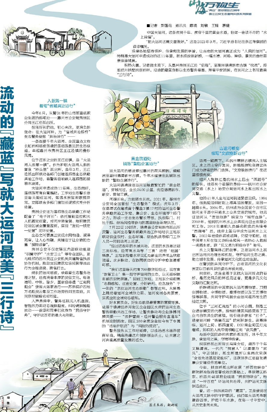 炽热大暑,记者循水南下,从嘉兴秀洲王江泾“启程”,至湖州德清新市古镇“枕流”,终抵杭州拱墅拱宸桥畔。沿途的藏蓝身影以生态警务着墨,押着平安韵脚,在长河之上书写最美“三行诗”。
