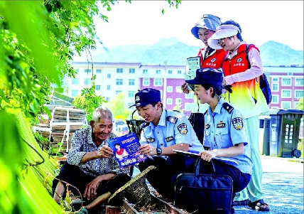 群体尤其是农村留守老人发放宣传资料,用通俗易懂的语言讲解养老诈骗特点、类型及常见套路,提高老年群体安全防范意识。图为八月二十八日,民警和志愿者在公园里向老人宣传防范养老诈骗知识。 通讯员 郑圻冬 摄