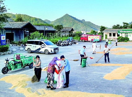 秋收之际,为有效解决周边农户晒谷难题,三门县公安局横渡派出所主动腾出门口水泥地坪供大家使用,既化解占道晒粮带来的交通拥堵及事故风险,又守护粮食颗粒归仓。图为10月13日下午,三门县公安局横渡派出所民警辅警利用工作间隙,主动协助农户抢收晾晒好的稻谷。通讯员 林利军 摄