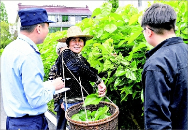 桐乡素有江南“蚕桑之乡”之美称,植桑养蚕缫丝是当地传统的经济产业。时下正是春蚕成长季,桐乡市公安局凤鸣派出所护航蚕桑经济高质量发展,排查周边不利于桑叶生长的环境因素,服务蚕农,助推乡村振兴和共同富裕。图为近日民警在联庄村走访蚕农。 记者 沈志良 摄