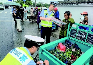 正是杨梅成熟季。6月20日,台州市公安局交通警察局直属一大队前所中队在辖区杨梅摊点发放交通安全宣传资料,讲解交通安全知识,为梅农的三轮车张贴反光贴、排查交通安全隐患,引导他们有序停放车辆。通讯员 何文斌 叶亚枚 摄