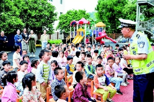暑假来临,6月19日下午,磐安县公安局交警大队民警来到方前镇幼儿园和小学,在互动中宣传交通安全知识。 通讯员黄晓娟摄