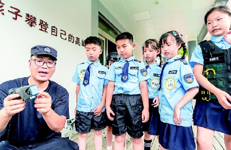 七月七日上午,舟山市公安局定海区分局第十二期警建暑托班正式开班,这也是分局连续十二年开设警娃暑托班。暑托班涵盖特警战术表演、警犬趣味活动及反诈、防溺水、交通安全等宣传,将进一步提升警娃自我保护能力。图为特警队员为警娃展示电击枪。