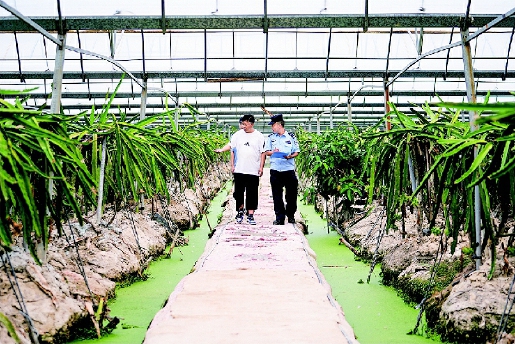 舟山市公安局普陀区分局东港派出所结合秋季农收特点,深入实施反诈宣传、矛盾调解等“田间警务”,为农业增效、农民增收保驾护航。图为十月十四日下午,民警在辖区一大棚进行走访。