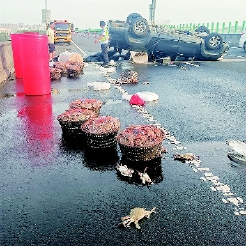 高速交警抵达现场后立即启动“海鲜运输应急预案”:警车后方预警,开启LED屏提示“前方事故减速”;协调高速公路施救力量对“四脚朝天”的货车进行处置。“一、二、三,用力!”交警与路勤人员喊着号子将事故车尽量往应急车道一侧拖移,确保最快速度恢复道路通行。随后,大家七手八脚地捡起掉落路面的白蟹,以求最大限度减少商户损失。