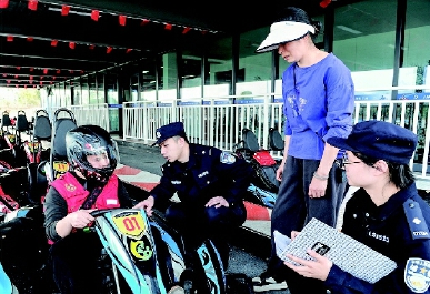 近日,东阳市公安局六石派出所民警对辖区一家游乐场所的设施进行安全检查,全力消除安全隐患。图为民警检查山地越野车的安全性能。