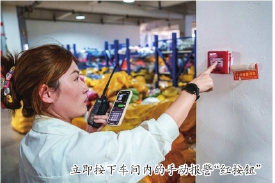 “不好了,不好了,着火了!”一名车间员工发现火情后一边呼喊,一边立即按下车间内的手动报警“红按钮”,引导员工们从楼梯安全出口有序疏散逃生。随后,她在3楼窗口不停地挥动颜色鲜艳的衣服向外呼救。