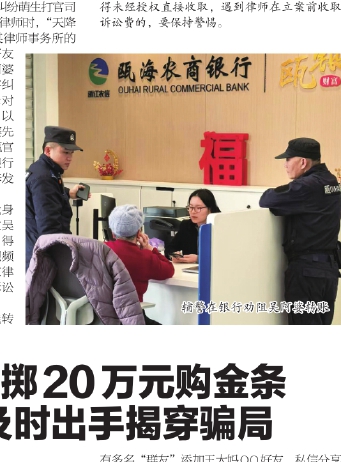 经了解,吴阿婆因一起山林纠纷萌生打官司维权的想法。当她四处打听靠谱律师时,“天降救星”——几天前,自称北京某律师事务所的“鲁律师”,主动向她发送微信好友申请。为能顺利打赢官司,吴阿婆迅速通过对方的好友申请,并将纠纷的来龙去脉及自身诉求告诉对方。“鲁律师”在了解情况后,以“走诉讼流程”为由,要求吴阿婆先缴纳21860元“诉讼费”。想打赢官司的吴阿婆按照对方要求,到银行准备转账“诉讼费”,幸好被小李发现异常,及时报警。