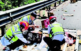 5月12日13时许,G60沪昆高速公路杭州方向277km处,一辆从金华返程的小货车突然变道,径直撞向相邻车道货车后侧翻,榴莲、西瓜等水果倾覆在第三、四车道上。据调查,驾驶员凌晨3时便赶往金华进货,连续高强度工作后,行车途中因极度困倦失去对车辆的控制。