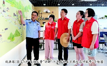 钱洪辉(图左)为“杏福义警”讲解“十里古银杏长廊生态样板带”手绘图